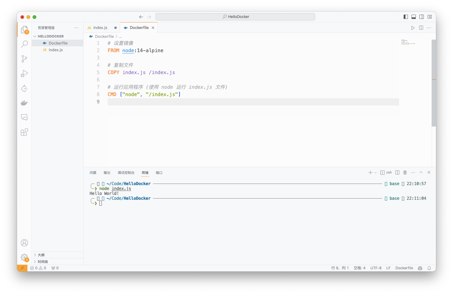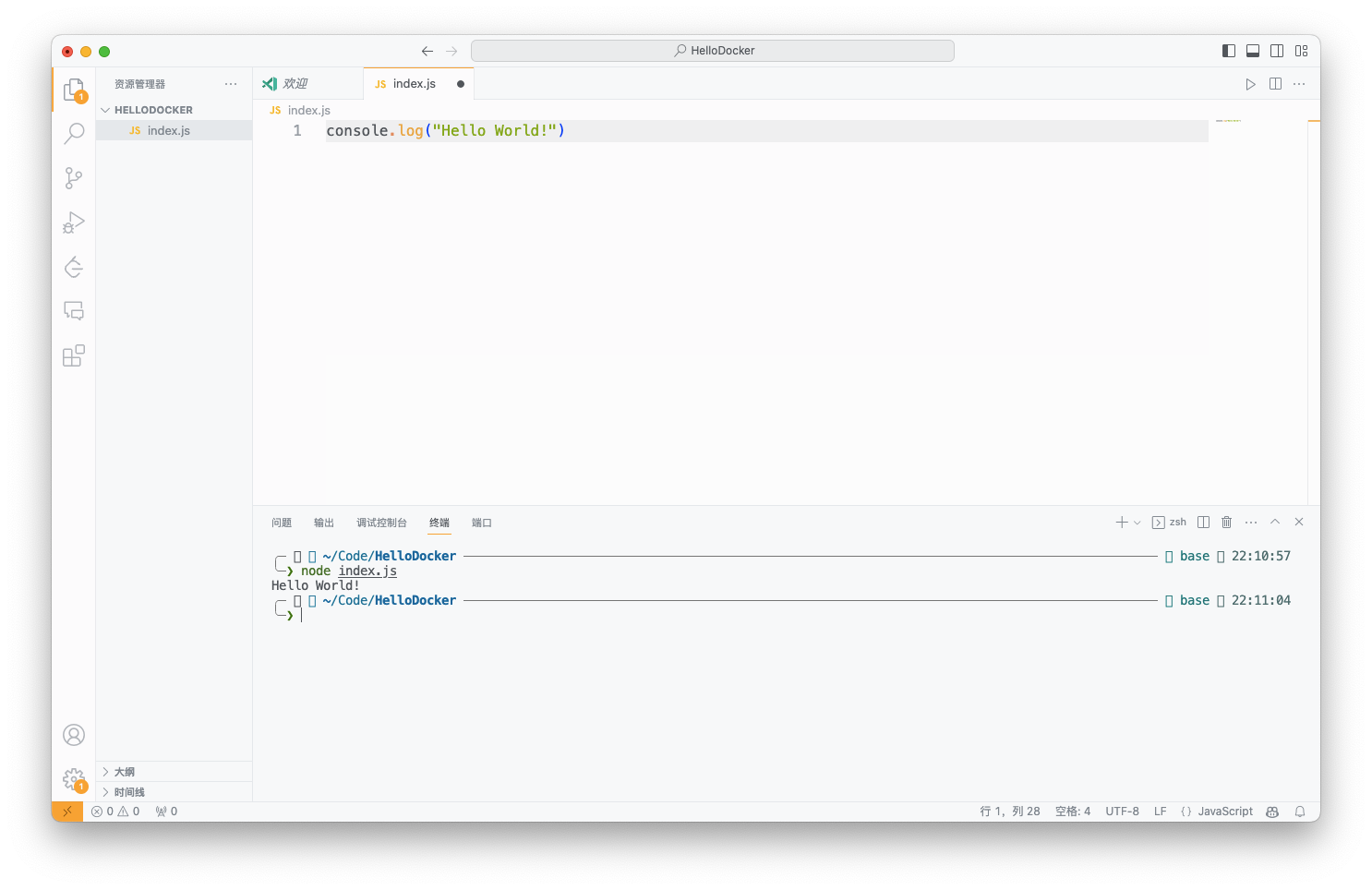 在项目文件夹中创建 index.js 文件并键入简单 JS 命令,使之在控制台输出语句;